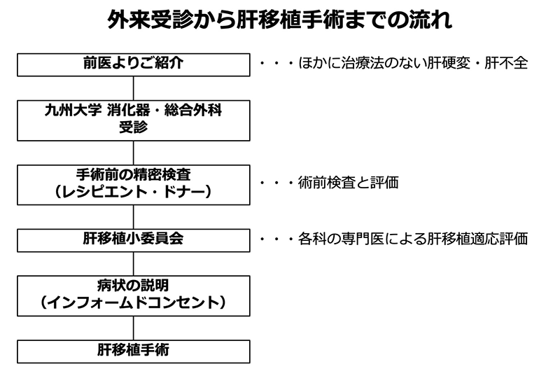肝移植をご希望の方は、予約の上、もしくはかかりつけ医より連絡して頂いた上で、九州大学の消化器・総合外科(第二外科)の外来(月・水・金)を受診して下さい。その際、かかりつけの病院がある場合は、出来るだけ主治医を通して受診して下さい。外来初診時に移植全般についての大まかな説明がなされます。その後、移植を希望される患者さんは、内科又は外科に入院して頂き、移植適応の判断に必要ないくつかの検査を行うことになります。外来受診時に、御家族内でドナー候補が決まっている場合は、ご一緒に受診されることをお勧めします。ドナー候補の方は、外来で血液検査・腹部エコーや、心電図・肺機能・レントゲンなどの一般検査の後、CT(肝臓の大きさや血管の解剖をみるため)を行います。